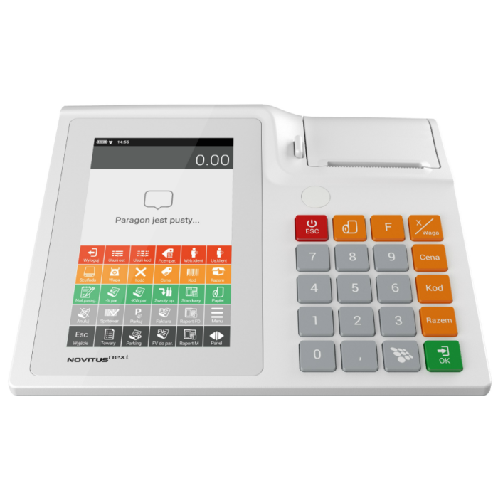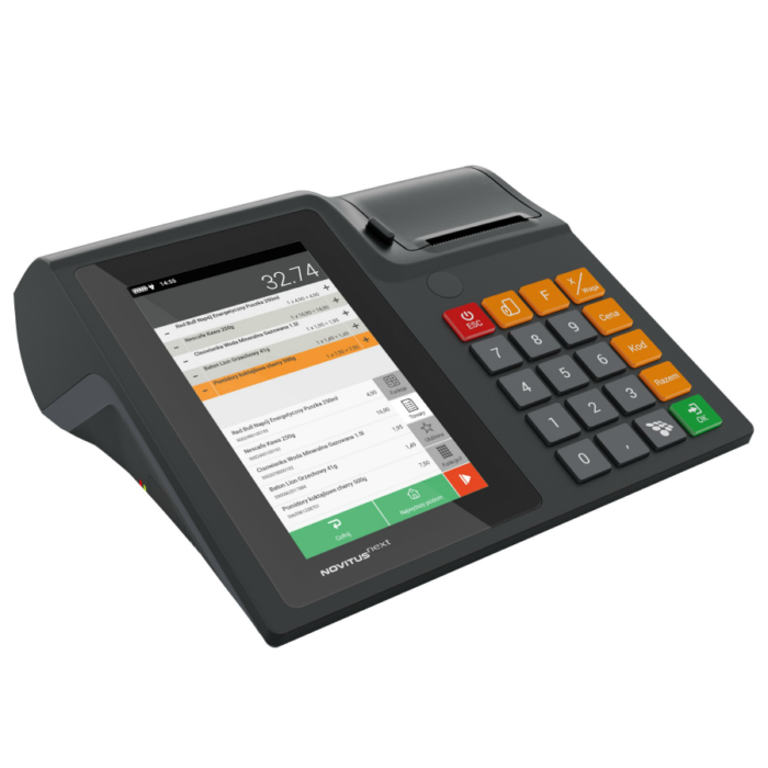 NEXT ONLINE – Kasa fiskalna o wymiarach 262 x 96 x 241 mm szerokość/wysokość/głębokość. Dzięki zastosowaniu w niej dotykowego tabletu praca na kasie stała się jeszcze bardziej intuicyjna i prostsza dla jej użytkownika. Kasa posiada także klawiaturę fizyczną tak, aby użytkownik miał pełną dowolność obsługi. Kasa posiada nieograniczoną limitami bazę towarową. Wystawia faktury i korekty, dokumenty zwrotu otwarte rachunki oraz współpraca z chmurowym systemem NoviCloud.